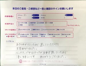 iPhone修理工房港北TOKYUS.C店/iPhoneXのバッテリー交換でお越しのお客様からいただいたお言葉