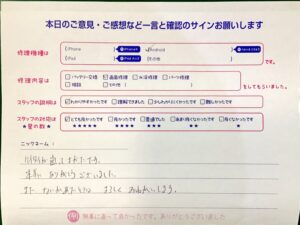 iPhone修理工房港北TOKYUS.C.店です!今回はiPad6のバッテリー交換でご来店されたお客様からのお声をご紹介します!