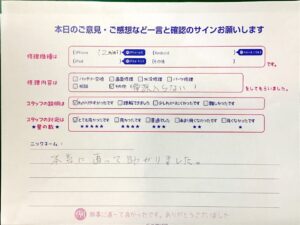 とても親切ていねいな対応で安心して修理をお願いすることが出来ました。